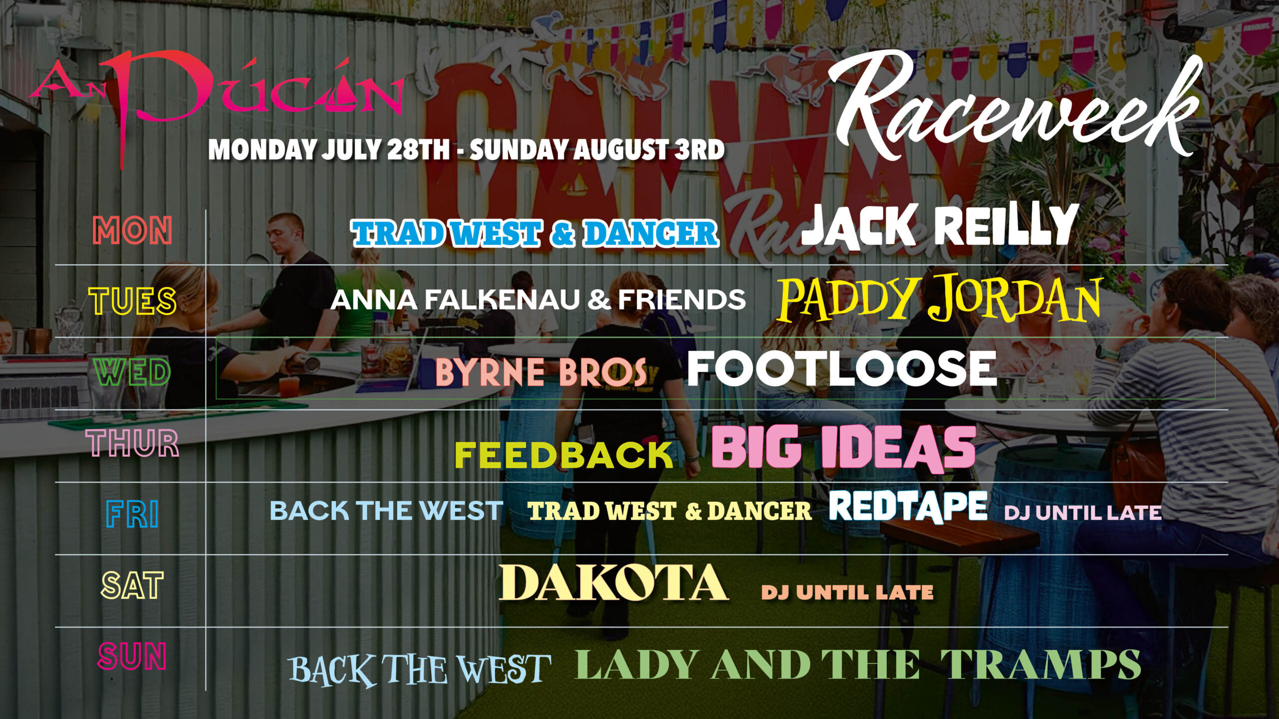 At An Púcán, the party doesn’t clock out after the last race—we’re just getting started. We’ve got live music every single night of the week, and during Race Week, we’re pulling out all the stops. From trad sessions that’ll have you clapping along to acoustic sets that hit the soul just right, our stage stays lively from early evenings to late nights. Fridays and Saturdays crank things up a notch with full bands and DJs spinning well into the early hours. Whether you’re easing into the night or keeping the buzz going, our music line-up is as solid as your race-day pint.